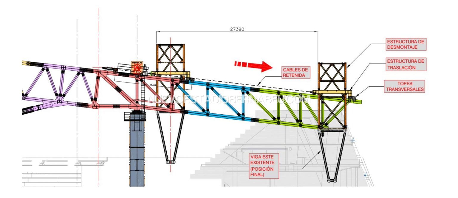Una vez realizado el desplazamiento de la cubierta nueva y situada en su posición definitiva, se procederá́ al desplazamiento de la viga del Este hasta su posición final para su descenso a tierra mediante grúas. En esta etapa se dispondrán los cilindros de heavy lifting en el lado Este, en las cercanías de los péndulos.