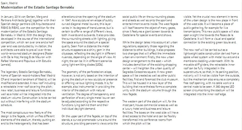 Es especialmente llamativa la posición de GMP-Archikecten. Este es el estudio de arquitectos elegido por el Real Madrid para desarrollar el proyecto y la reforma del Nuevo Bernabéu, nunca desde el día 31 de enero de 2014 confirmó en su página web la existencia del proyecto. Pues bien, a día de hoy y por arte de magia su página web tanto en su versión internacional como en su versión en español acogen el proyecto datado en 2015 del estadio del Real Madrid y aportan mucha información como se puede ver en la imagen siguiente.
